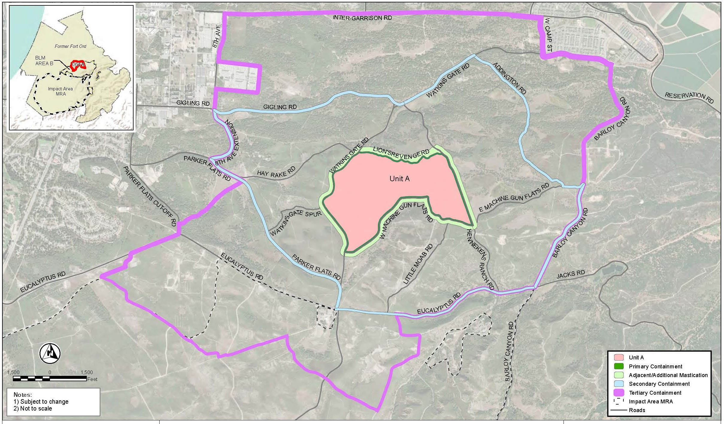 Where will the 2025 prescribed burn take place? Unit A in the Fort Ord National Monument. See map below for the location of Unit A and prescribed burn containment lines (fuel breaks). Click to enlarge.